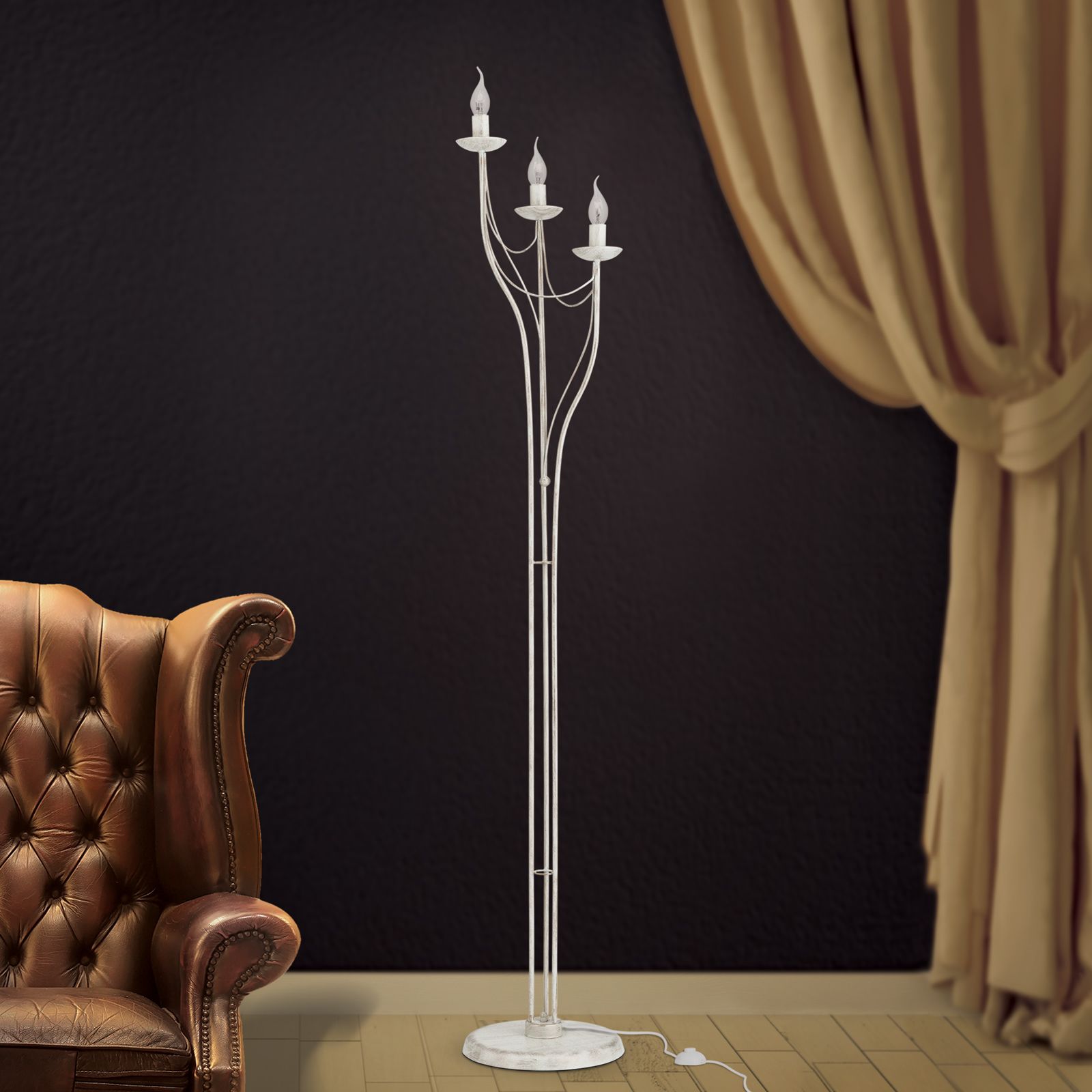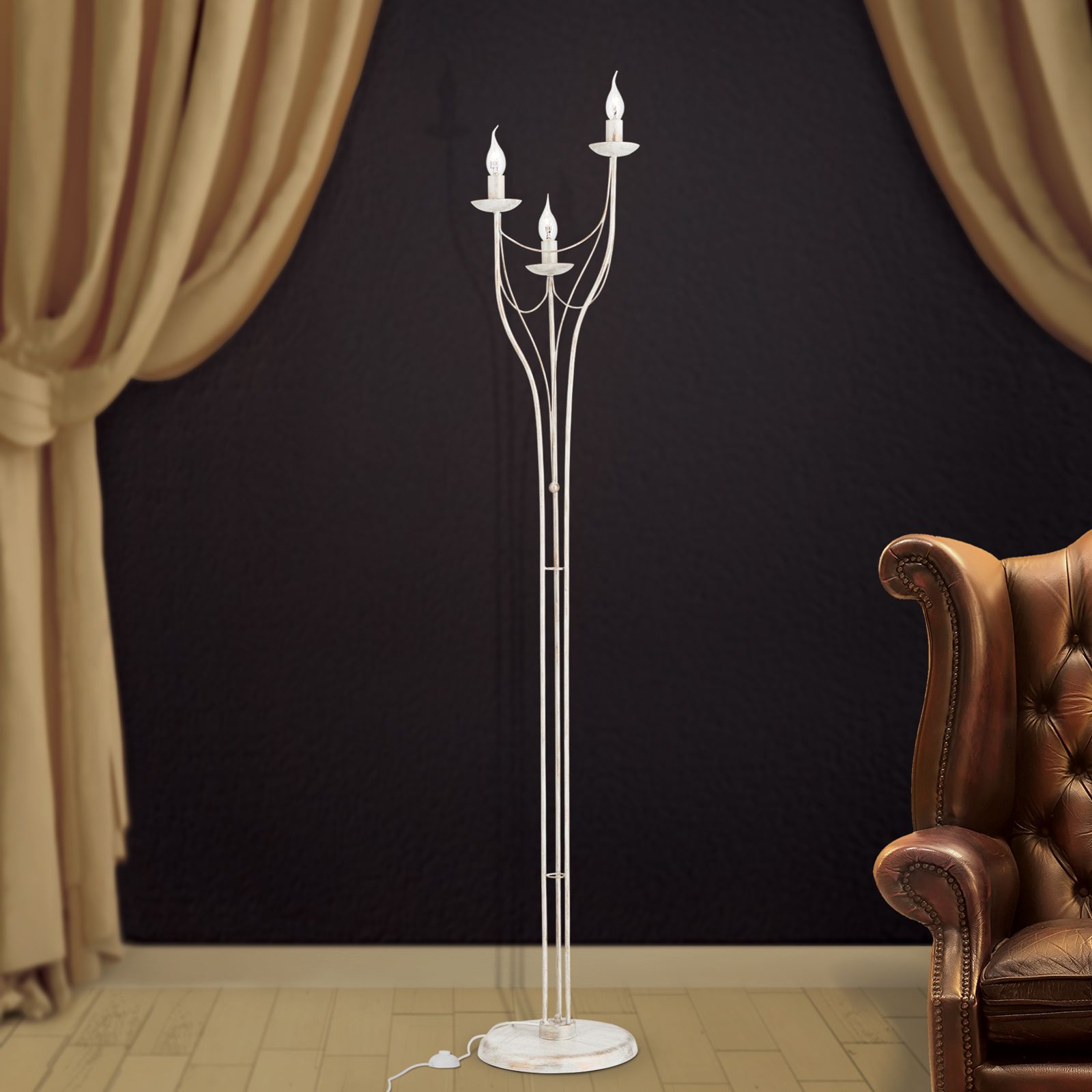 Die Stehleuchte aus der VELA-Reihe erinnert an eine Mischung aus barockem Kandelaber und Gaudischem Art Nouveau. Die Kombination verschiedener Epochenstile gehört zu den mutigsten und schwierigsten Aufgaben im Leben von Designern. Wenn der Balanceakt gelingt, ist viel gewonnen: Es entsteht ein Werkstück, das zu unterschiedlichsten Einrichtungsensembles passt. Neben einem Konzertflügel wird sich die Leuchte genauso gut machen wie in einer modernen Wohnzimmerecke. Drei E14-Fassungen liefern je bis zu 40 Watt Leistung. Windstoßkerzenlampen erzeugen eine heimelige Stimmung.