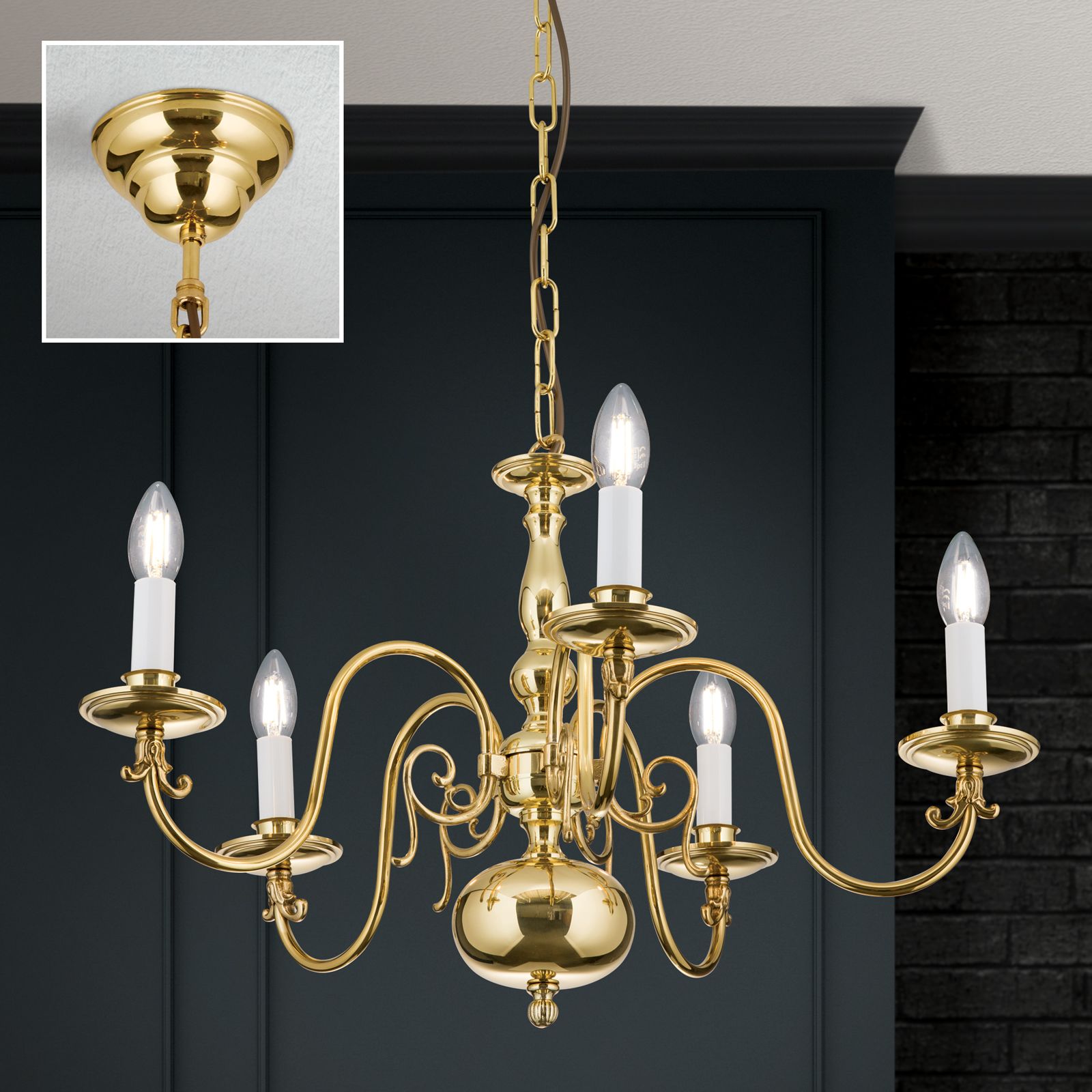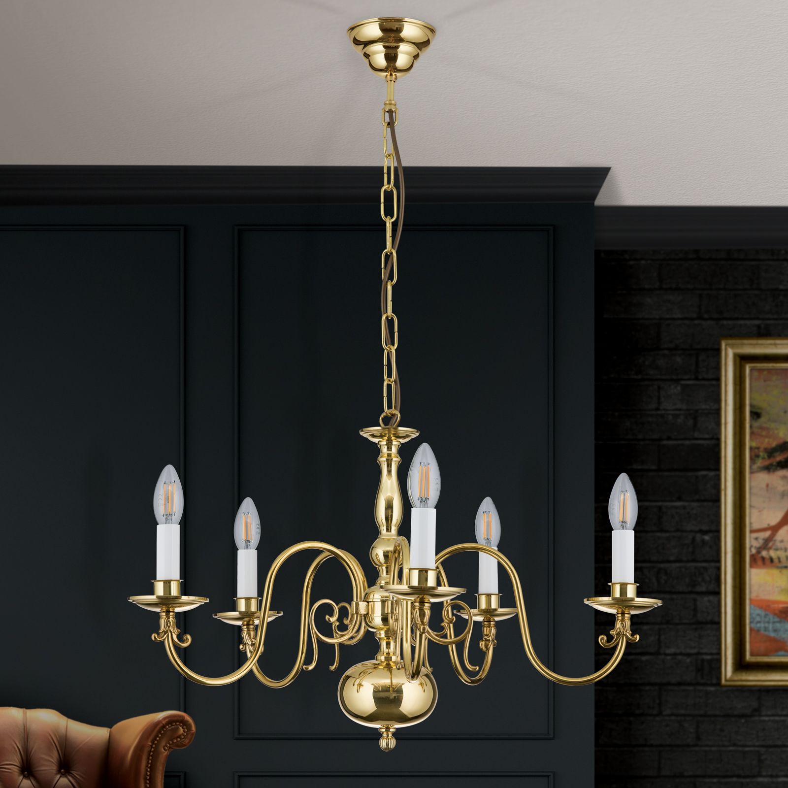Der 5-flammige Luster aus der Reihe FLÄMISCH ist der ideale Leuchtkörper für ein ungefähr zwanzig Quadratmeter großes Wohnzimmer. Der Raum erhält eine kräftige, zentrale Grundbeleuchtung und vor allem ein besonders schön gearbeitetes Einrichtungselement. Fünf Arme gruppieren sich um einen kunstvoll profilierten Schaft mit für den flämischen Kronleuchter charakteristischer Kugel. Am Deckenende schließt eine Messingrosette das Ensemble ab. Der Leuchter fügt sich harmonisch in jedes mit warmen Materialien ausgestattete Interieur. Die Leuchte verfügt über fünf E14-Fassungen mit je bis zu 40 Watt.