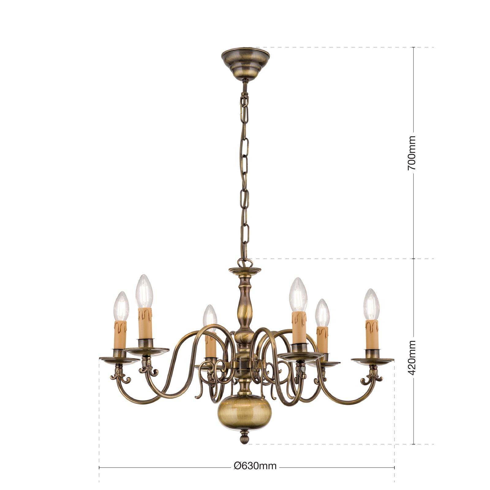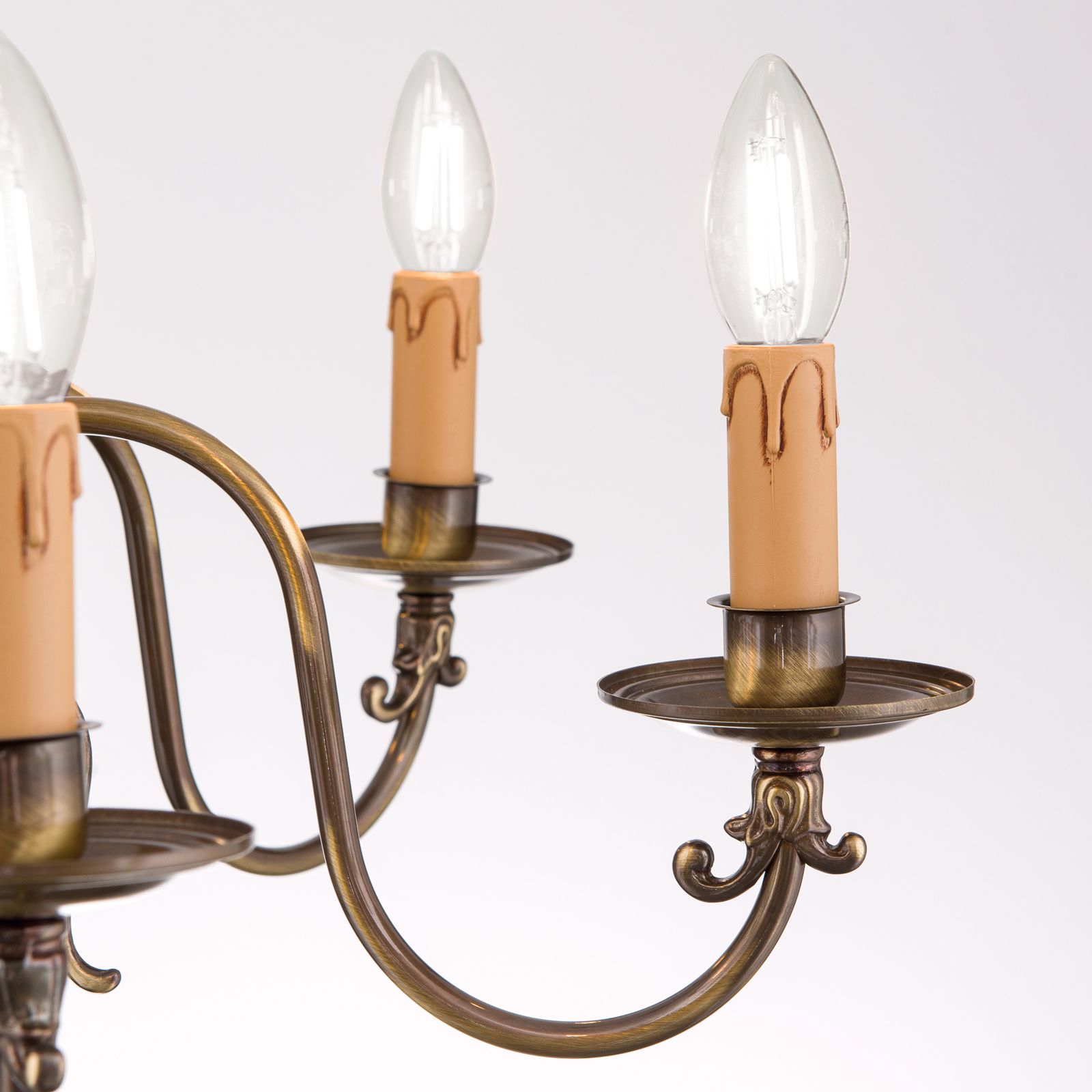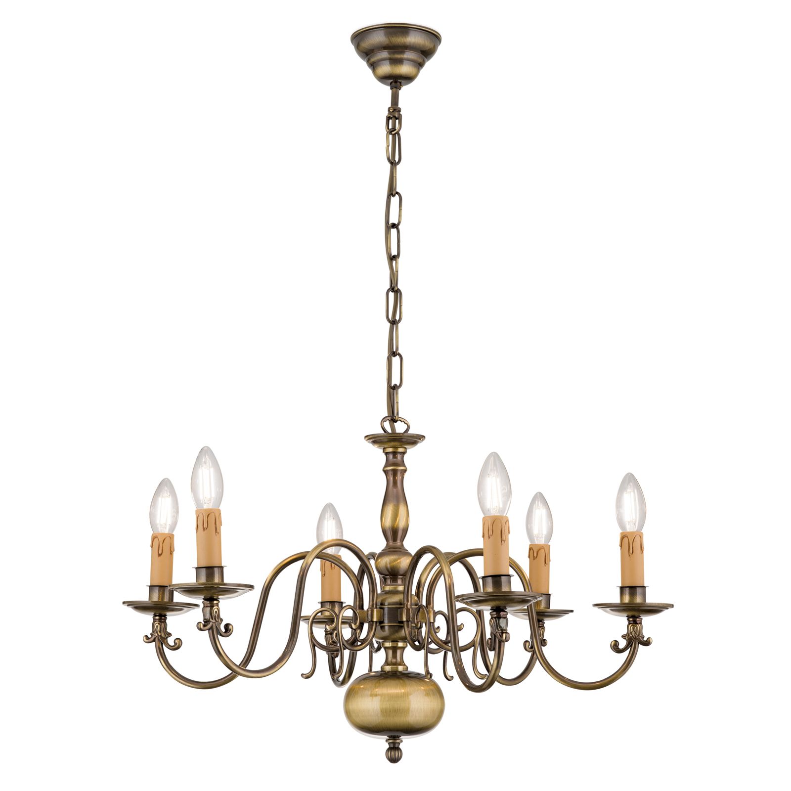 Der 6-armige Kronleuchter aus der Serie FLÄMISCH ist in Messing und Patina erhältlich.