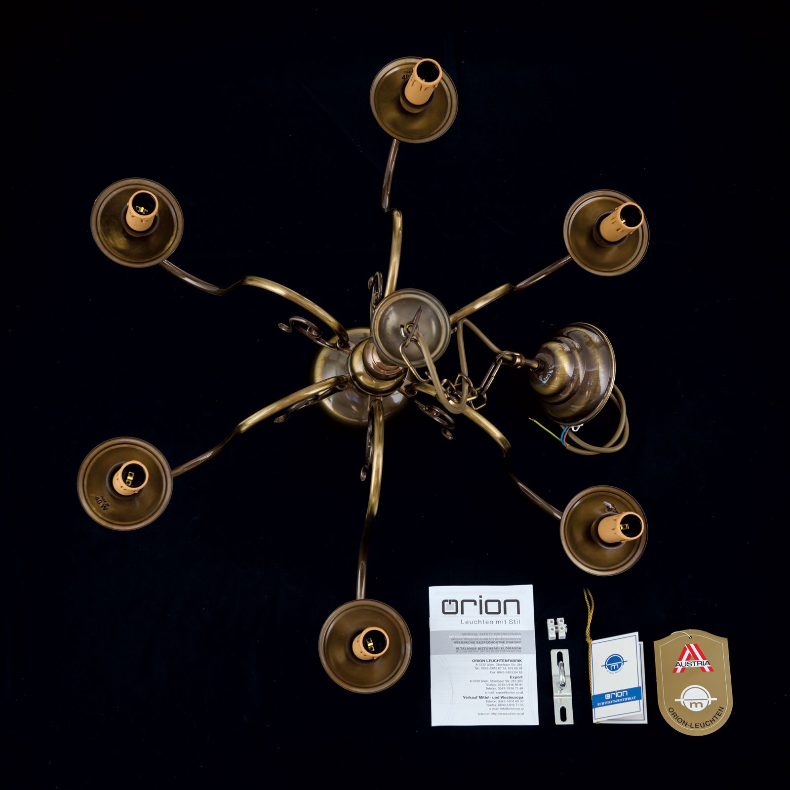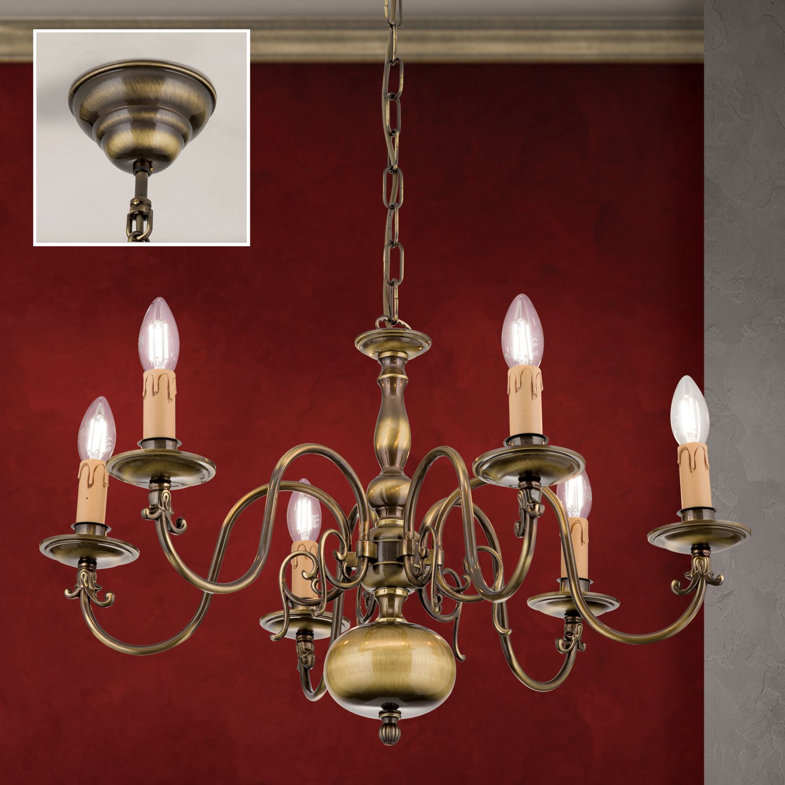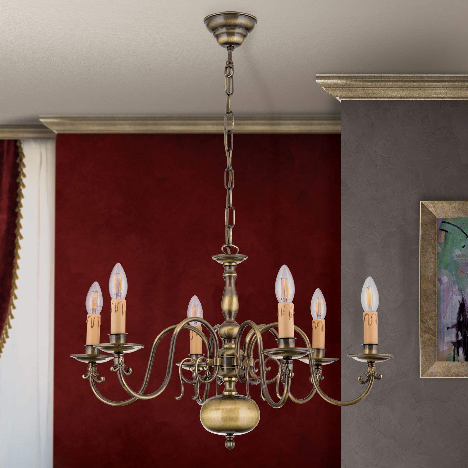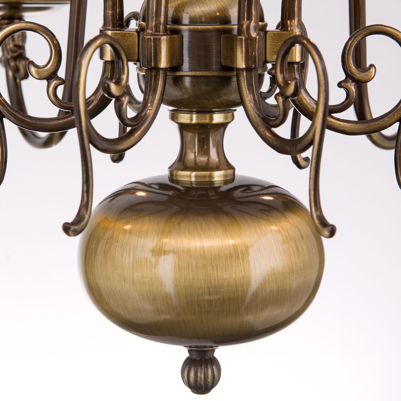 Der 6-armige Kronleuchter aus der Serie FLÄMISCH ist in Messing und Patina erhältlich.