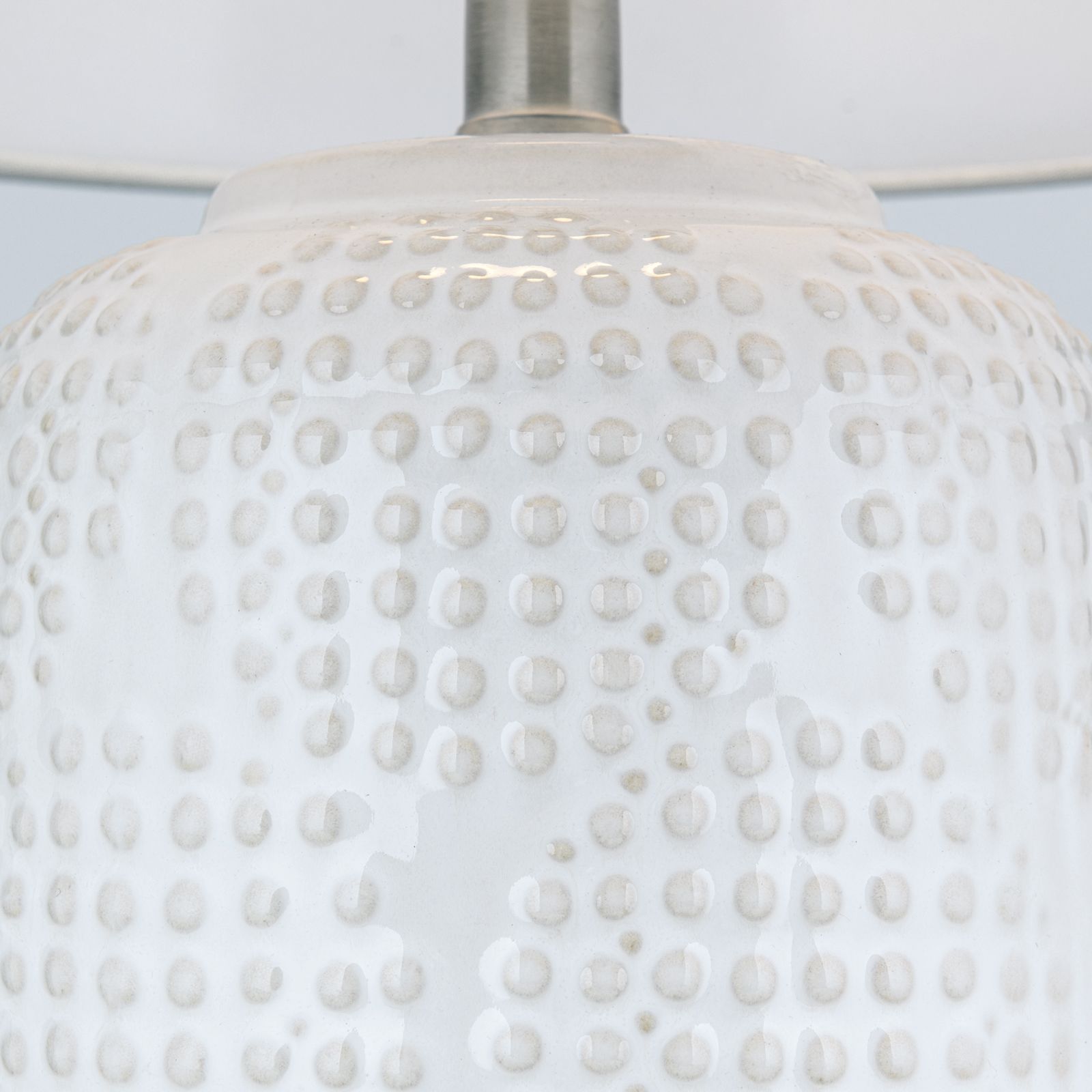 Die Tischlampe CORAL besticht durch ihr elegantes Design und hochwertige Verarbeitung. Mit einer Gesamthöhe von 51 cm fügt sie sich perfekt in jeden Raum ein und sorgt für eine angenehme Beleuchtung. Der weiße Keramikfuß ist mit einem stilvollen Dekor versehen, das für einen Hauch von Raffinesse sorgt. Der cremefarbene Leinenschirm ergänzt das edle Design und streut das Licht sanft für eine behagliche Atmosphäre. Der Schalter befindet sich am Kabel, was eine einfache Bedienung ermöglicht. Der Schirm wird mit einem Schraubring sicher an der Fassung fixiert. Ausgestattet mit einer E27-Fassung, ist die Tischlampe mit einer Vielzahl von Leuchtmitteln kompatibel. Ob als Leseleuchte auf dem Nachttisch oder als dekoratives Element im Wohnzimmer – die Tischlampe CORAL ist ein stilvoller Blickfang, der jede Einrichtung aufwertet.