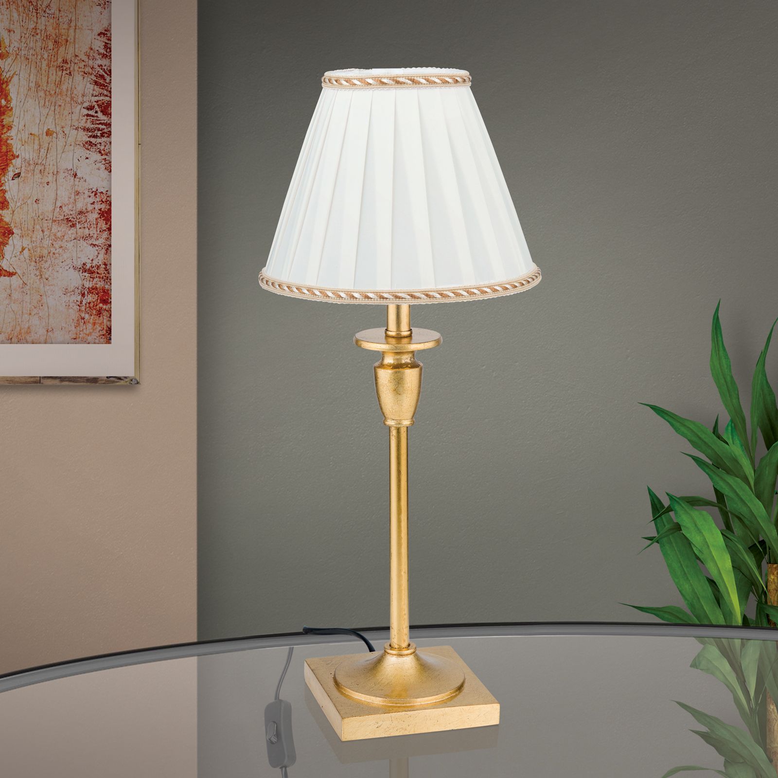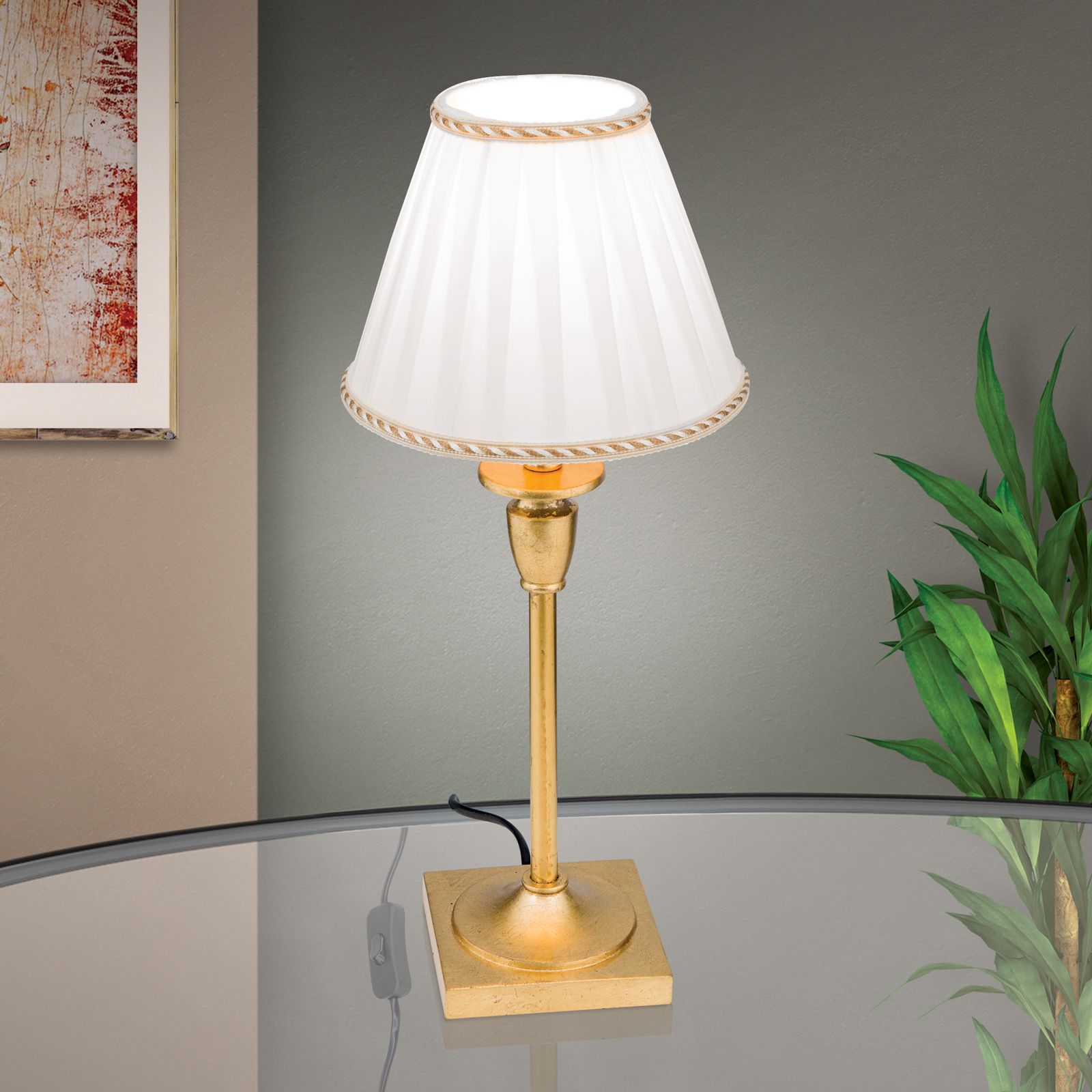 Als dekoratives Element im Wohn- oder Schlafzimmer sind Tischlampen immer ein Blickfang. FONSA steht dabei für herzliche Klassik und zeigt vor allem im Detail ihren eindrucksvollen Charakter. Ein weißer Plisseeschirm steht im harmonischen Zusammenspiel mit einer antik goldenen Zierbordüre am oberen und unteren Rand des Schirms. Der Standfuß spiegelt diese Farbgebung in antikem Gold wieder und unterstreicht das Design mit einer Patina ähnlichen Oberfläche.