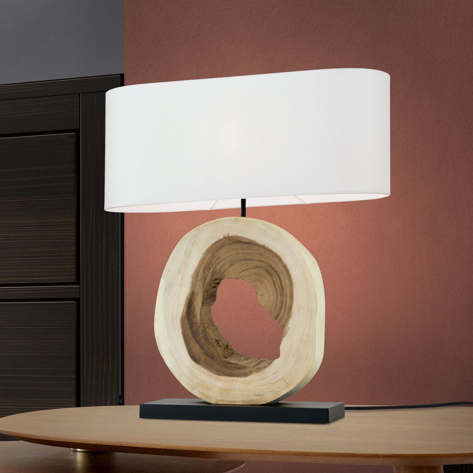 Holz und Stoff - die Kombination dieser Naturmaterialien lässt Herzen höherschlagen. NATHAN überzeugt mit einem formschönen Holzring, der zugleich rustikal wirkt und die Leuchte mit ihrem weißen Stoffschirm perfekt ergänzt. Als Lichtspender und dekorativer Einrichtungsgegenstand macht sich diese Leuchte besonders gut auf Kommoden im Vorzimmer, Wohn- oder Schlafzimmer. Das Zusammenspiel verschiedener Naturmaterialien hüllt den Wohnraum in ein wohliges Ambiente, ob nun eingeschalten oder nicht. Die E27-Fassung kann mit maximal 60 betrieben werden.