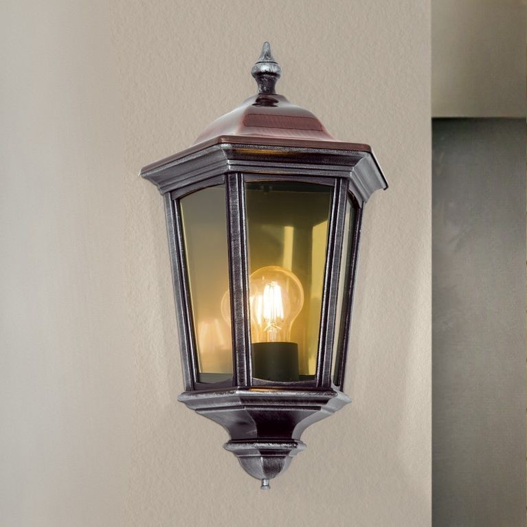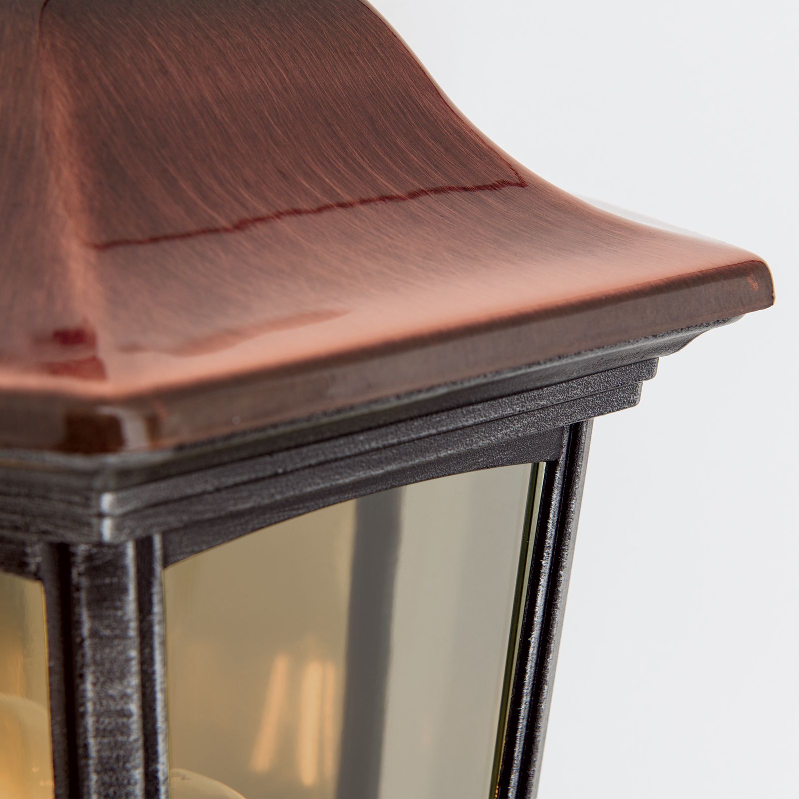Wegen ihres zeitlosen Erscheinungsbildes und bewährten Designs vereint sich die Wandaußenleuchte aus der Serie HERMINE harmonisch mit verschiedensten Baustilen oder Gartengestaltungen. Ausgehend von einem in Schwarzsilber gehaltenen Metallcorpus in Laternenoptik sorgt das kupferbraune Dach für einen rustikalen Touch im Gesamtbild. Robuster Siluminguss und die Schutzartz IP44 machen HERMINE besonders widerstandsfähig und ideal geeignet für den Außenbereich.