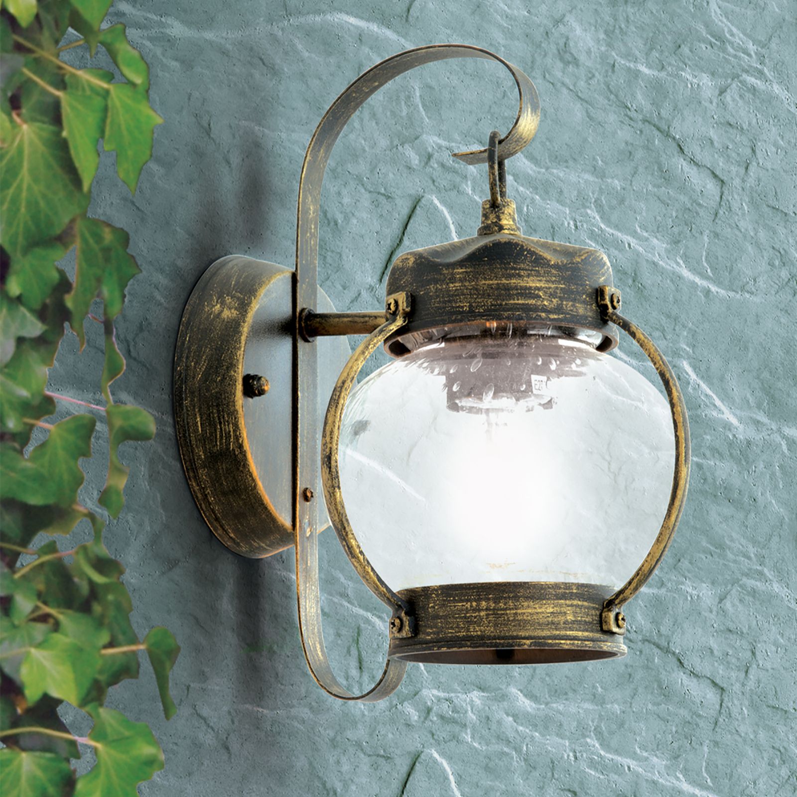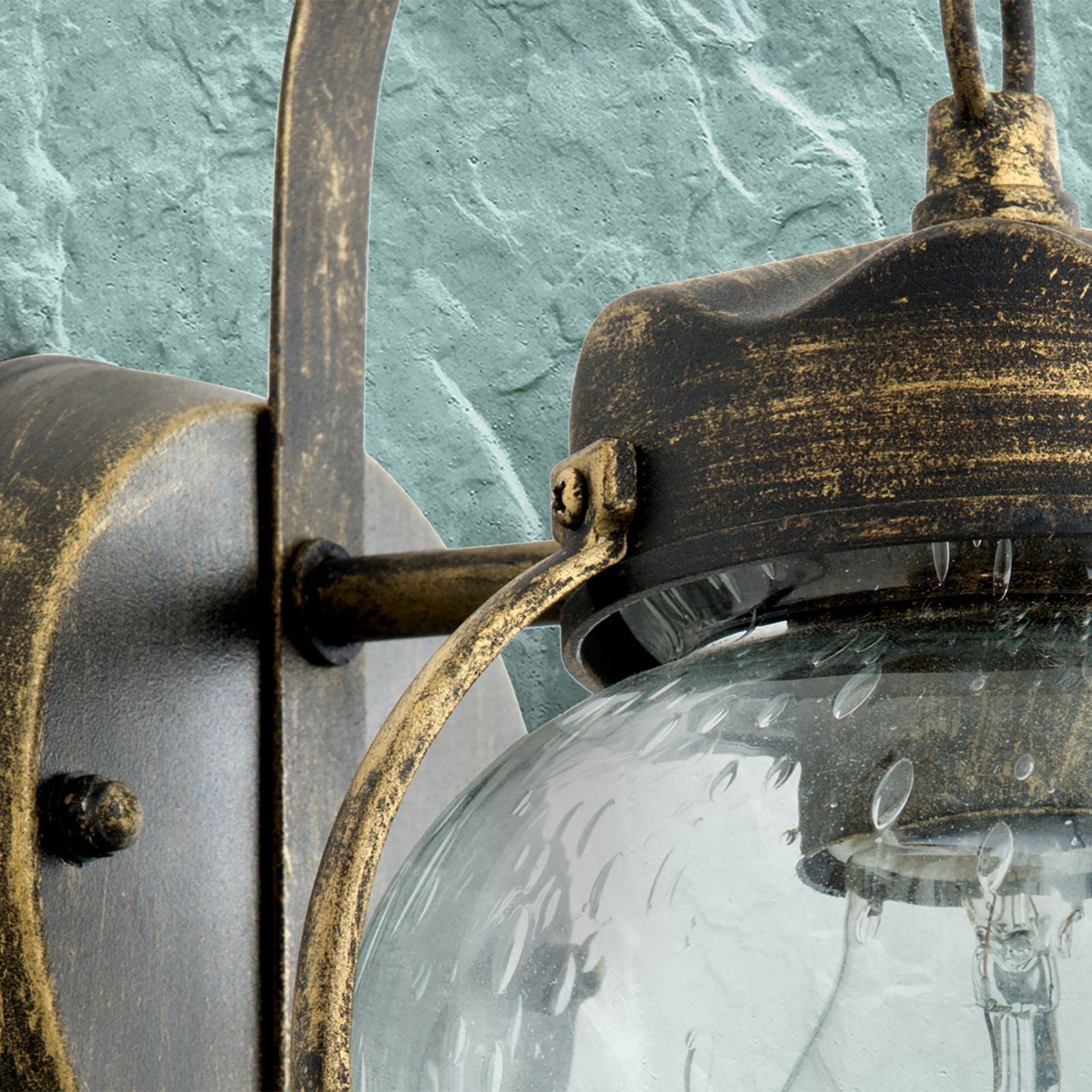 Die runde Wandaußenleuchte aus der TAVERNA-Serie erweckt den Eindruck, dass man sie vom schmiedeeisernen Haken nehmen kann, um einem Gast den Weg zu seiner Kutsche für die Heimreise zu weisen. Dieser Retroeffekt wird verstärkt durch die schwarz-goldene, patinaähnliche Oberfläche und die an gealtertes Glas erinnernden Bläscheneinschlüsse im Schirm. Das Material des Gestells, eine äußerst beständige Aluminium-Silizium-Legierung, garantiert die Eignung der Leuchte für den Außeneinsatz auf einer Terrasse oder auch in einer Pergola. Eine E27-Fassung bietet bis zu 60 Watt Leistung. Mit energieeffizienten LED-Lampen lasen sich zudem Strom und Kosten einsparen.