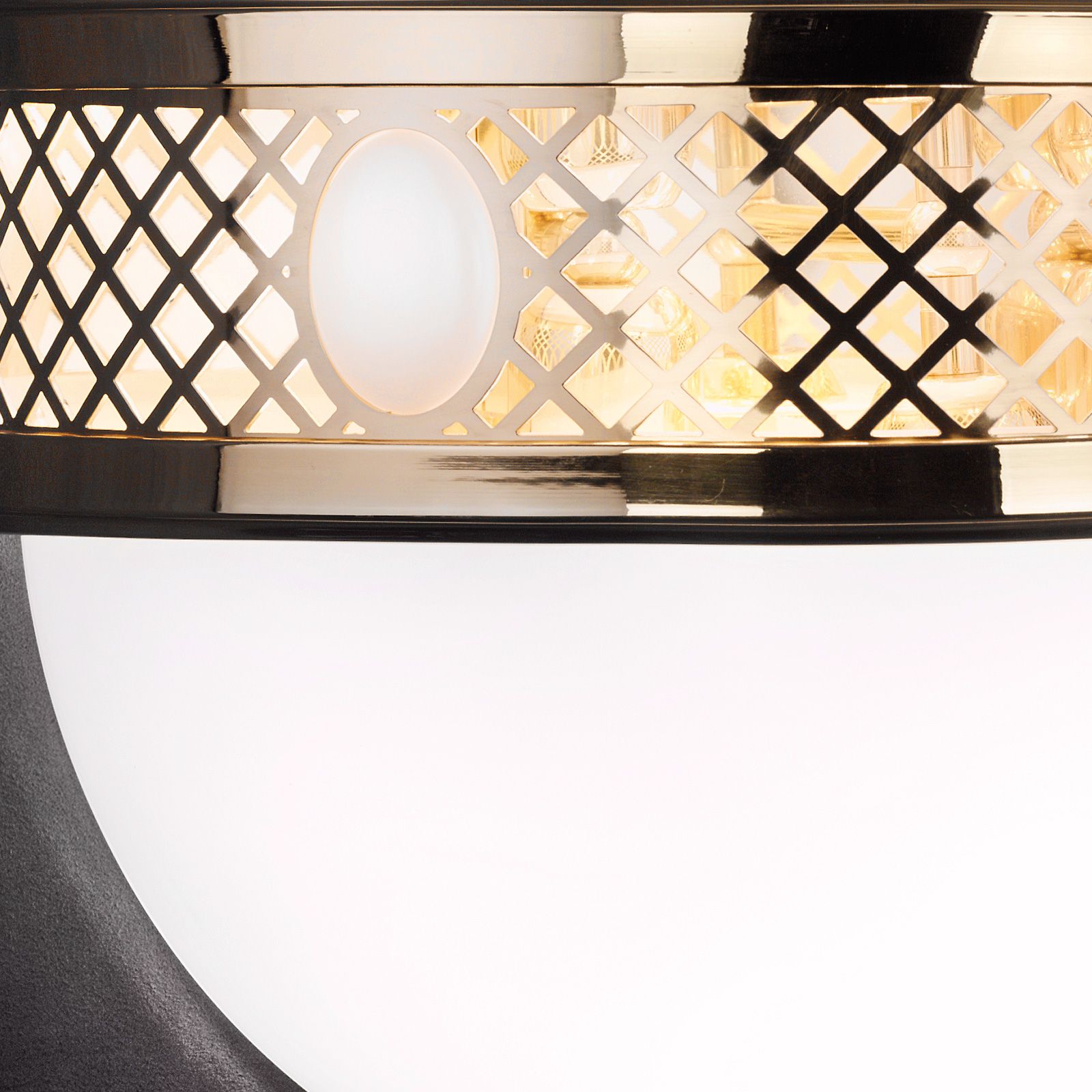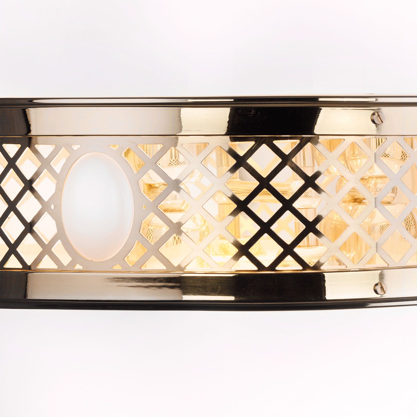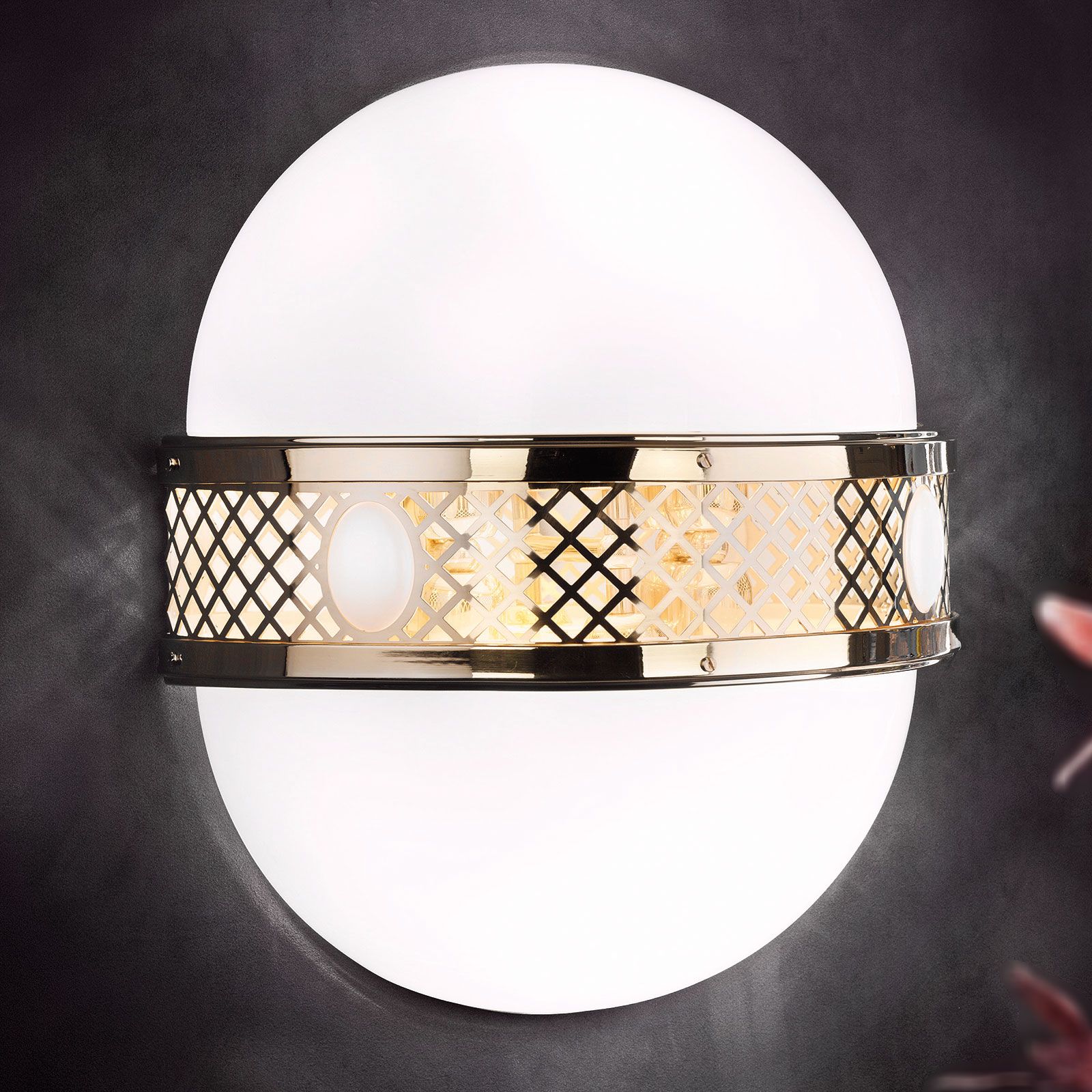 Eine Leuchte wie ein edles Juwel - das ist die Assoziation zur 6-flammigen Wandleuchte aus der Kollektion ALT WIEN. Umspielt von sich kräuselndem Dampf einer Melange, und fertig ist das Fin de Siècle-Idyll. Der Jugendstileinfluss ist unverkennbar. Das Messingband, das sich um den Schirm windet, ist mit zurückhaltender, stiltypischer Ornamentik verziert. Ellipsenförmige Appliken in einem feinen Gitter werden von zwei Messingreifen eingerahmt. Die selbstbewusste Eleganz dieser Epoche lässt jedes stilvoll traditionelle oder moderne Interieur erstrahlen. Die Wandleuchte ist mit sechs E27-Fassungen zu je maximal 60 Watt versehen.
