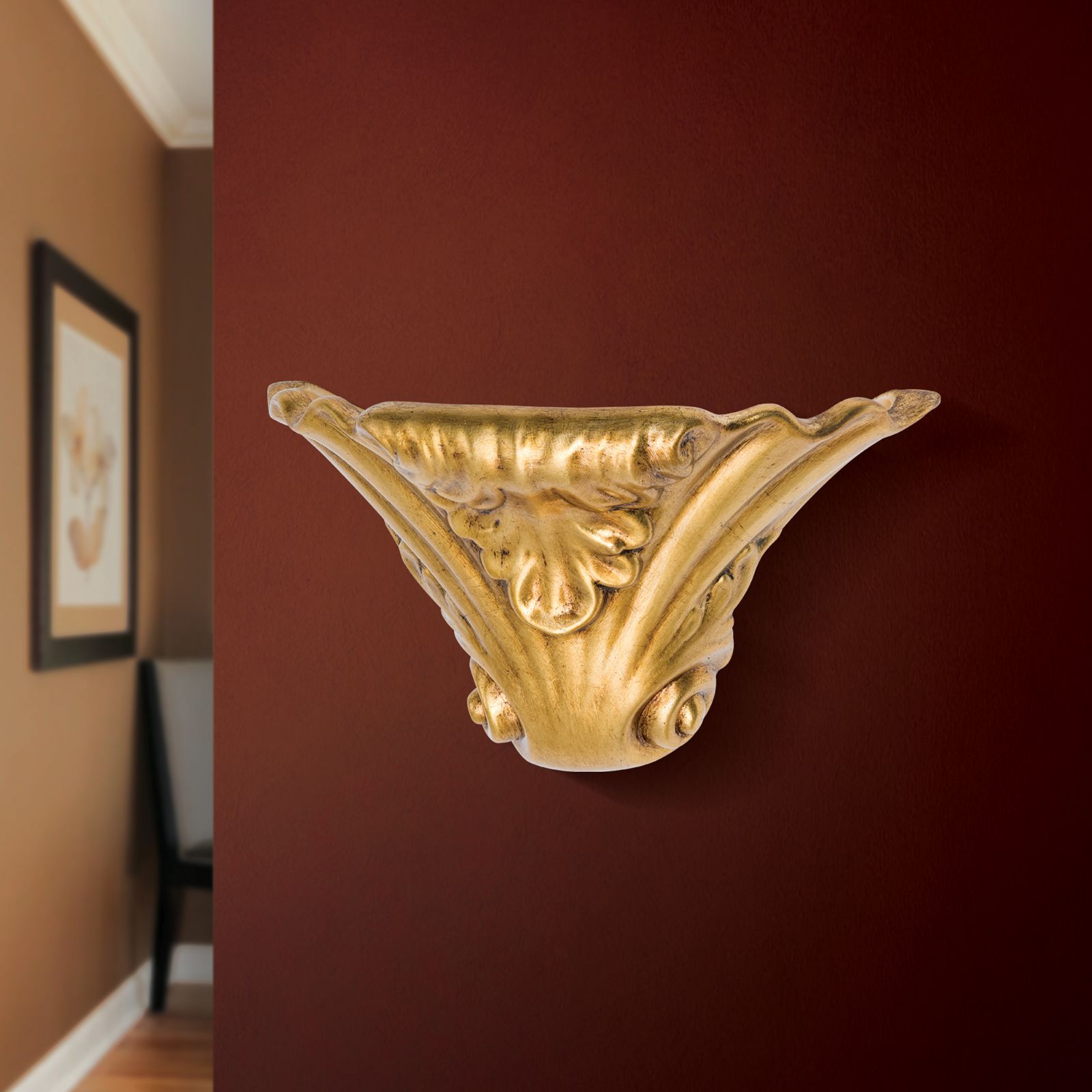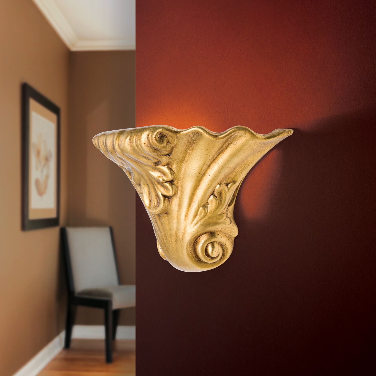 Die Gipswandleuchte enthält eine Altgold-Veredelung und ist die perfekte Ergänzung für Räume mit reicher Stuckatur und antiquarischem Mobiliar. Sie kann aber ebenso in einem modernen Ambiente eingesetzt werden, wo sie durch den stilistischen Bruch einen attraktiven Kontrast erzeugt. Angebracht im Flur oder Treppenhaus, sorgt sie für eine freundliche Atmosphäre.