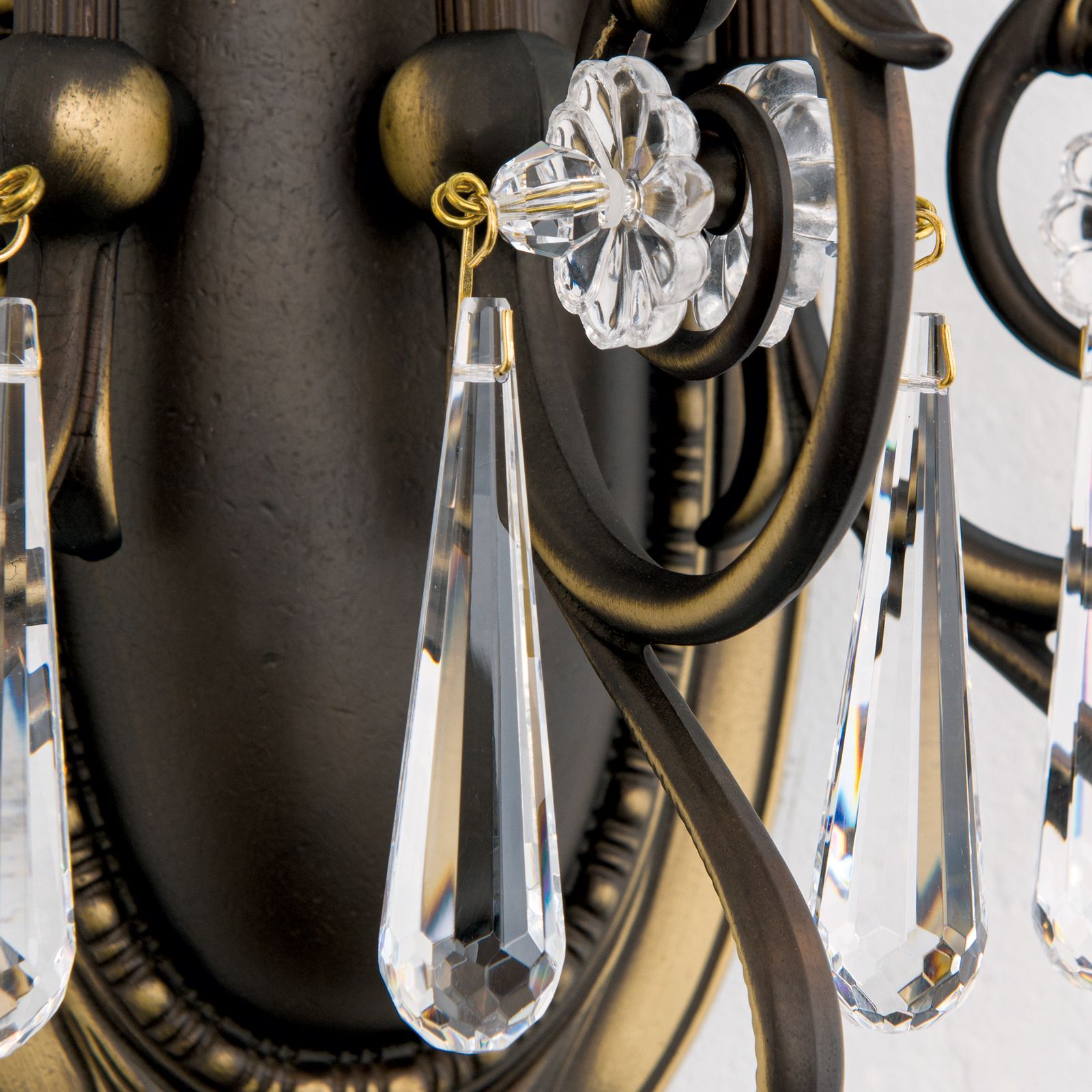 Die floral verzierte ovale Wandhalterung aus Vollmessing trägt 3 schwungvoll gebogene kannelierte Arme, die mit tropfenförmigen 1A Vollschliff Kristallen bestückt sind. Die im Diamantschliffverfahren hergestellten blütenförmigen Schirme bestehen aus klarem Kristallglas, wodurch das Licht breit gestreut wird.