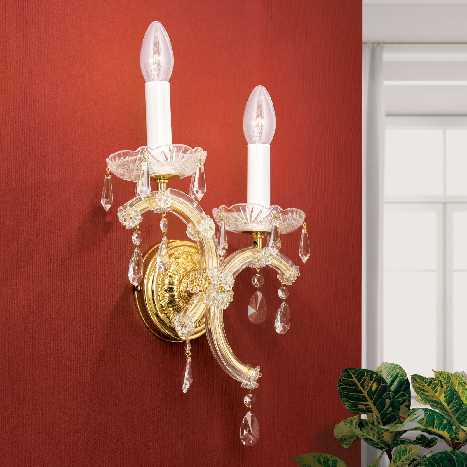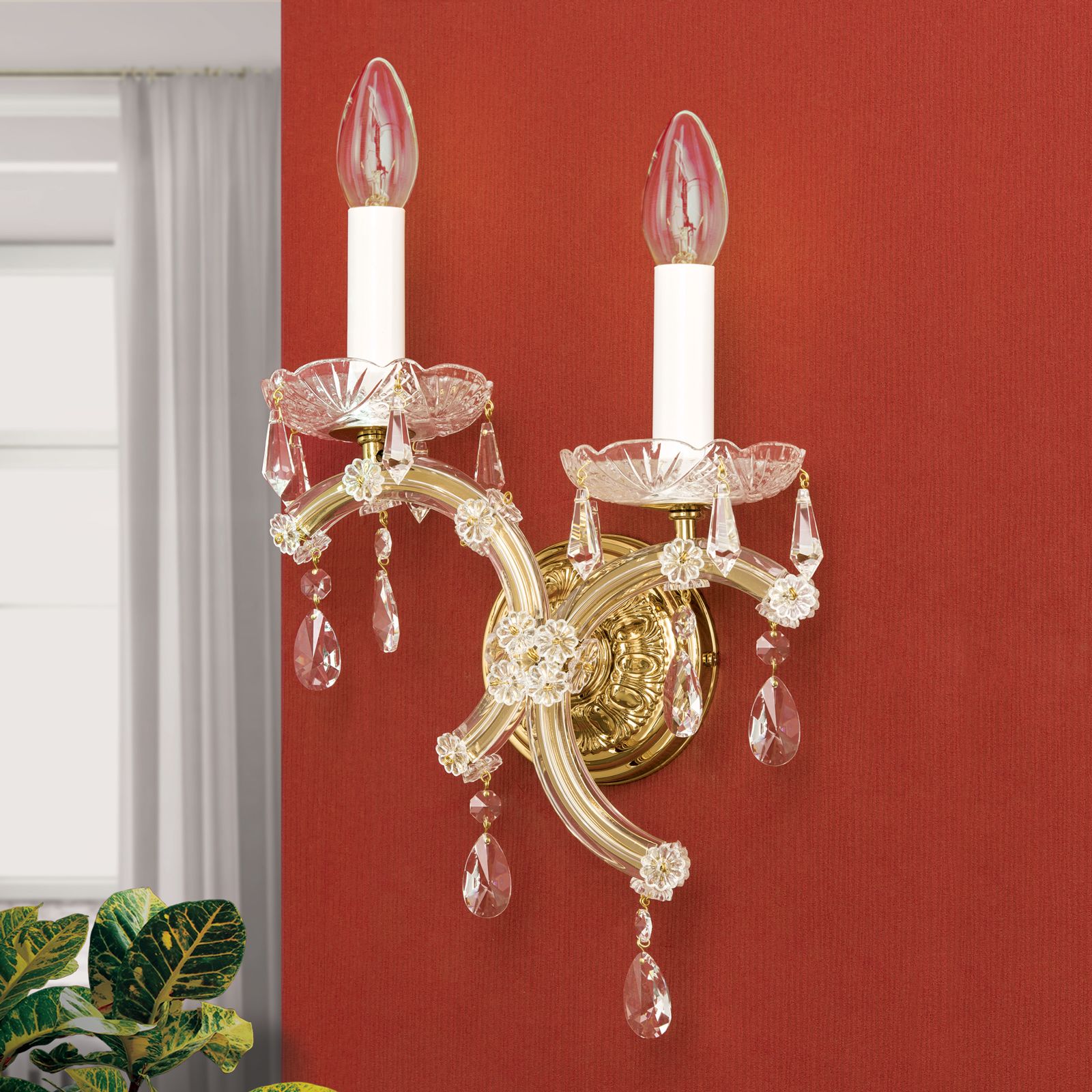 Die 2-flammige Wandleuchte mit rechts niedriger gesetzter Flamme aus der Kollektion MARIA THERESIA ist die spiegelverkehrte Version der Wandleuchte mit links niedrigerer Flamme. Die Kombination beider miteinander ergäbe ein schmuckes Ensemble. Beidseits eines schweren Barockmöbels oder eines Biedermeiersofas entsteht so eine stilvolle Lichtklammer. Reicher Kristallbehang aus Österreich, vergoldete Arme und eine elegante Wandrosette verbreiten fürstliches Flair. Zwei halbkreisförmige Bögen stützen die auf Tropfschalen stehenden Tüllen. Die Wandleuchte verfügt über zwei E14-Fassungen zu je höchstens 40 Watt. Mit energieeffizienten LED-Lampen braucht man nur unmerklich mehr Strom als mit Kerzen.
