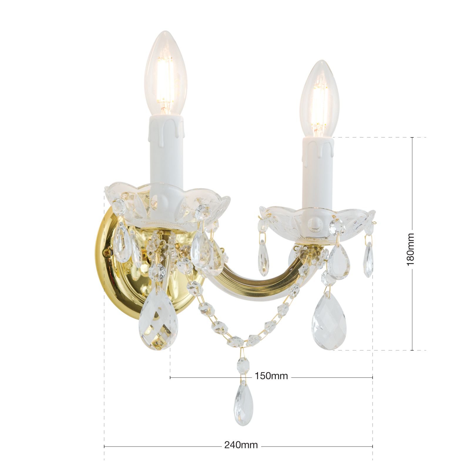 Die 2-flammige Wandleuchte aus der MARIE CLAIRE-Produktreihe kann man aufgrund ihres erhabenen Äußeren als Wandschmuck bezeichnen. Gleich einem Diadem, das ein edles Haupt krönt, erhebt diese Leuchte einen Raum in den Adelsrang. Die hochwertigen Glasarbeiten, Kristalle, Ketten, die goldene Wandrosette: Alles strahlt gelassene Schönheit aus. Setzt man zudem Windstoßkerzen in die Fassungen, ist das Bild perfekt. Die Wandleuchte mit zwei E14-Fassungen liefert zweimal bis zu 40 Watt Leistung. Klima und Umwelt sind noch einen letzten Gedanken wert: Energieeffiziente LED-Lampen helfen.