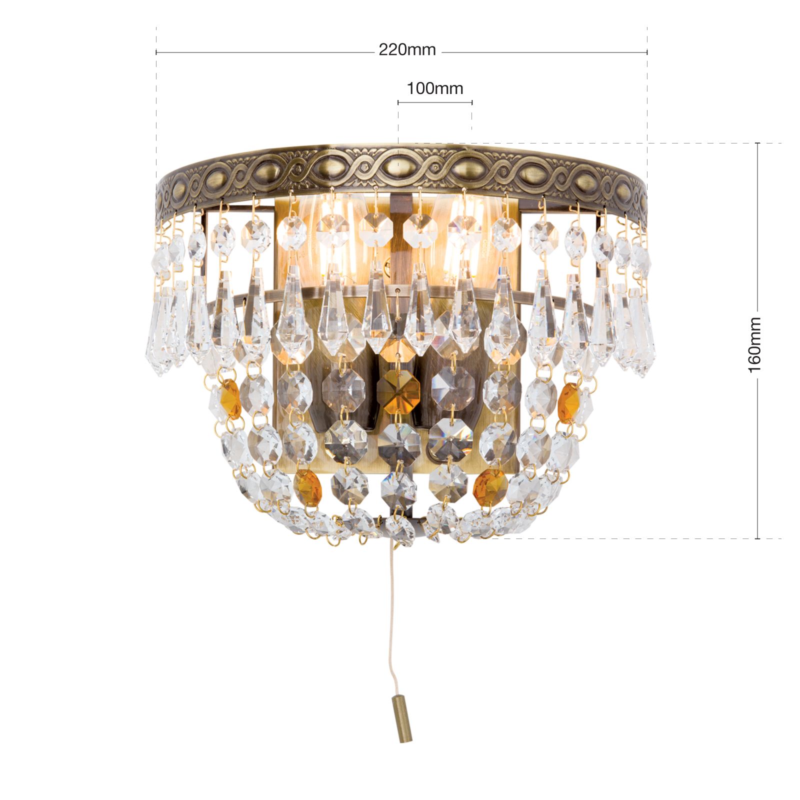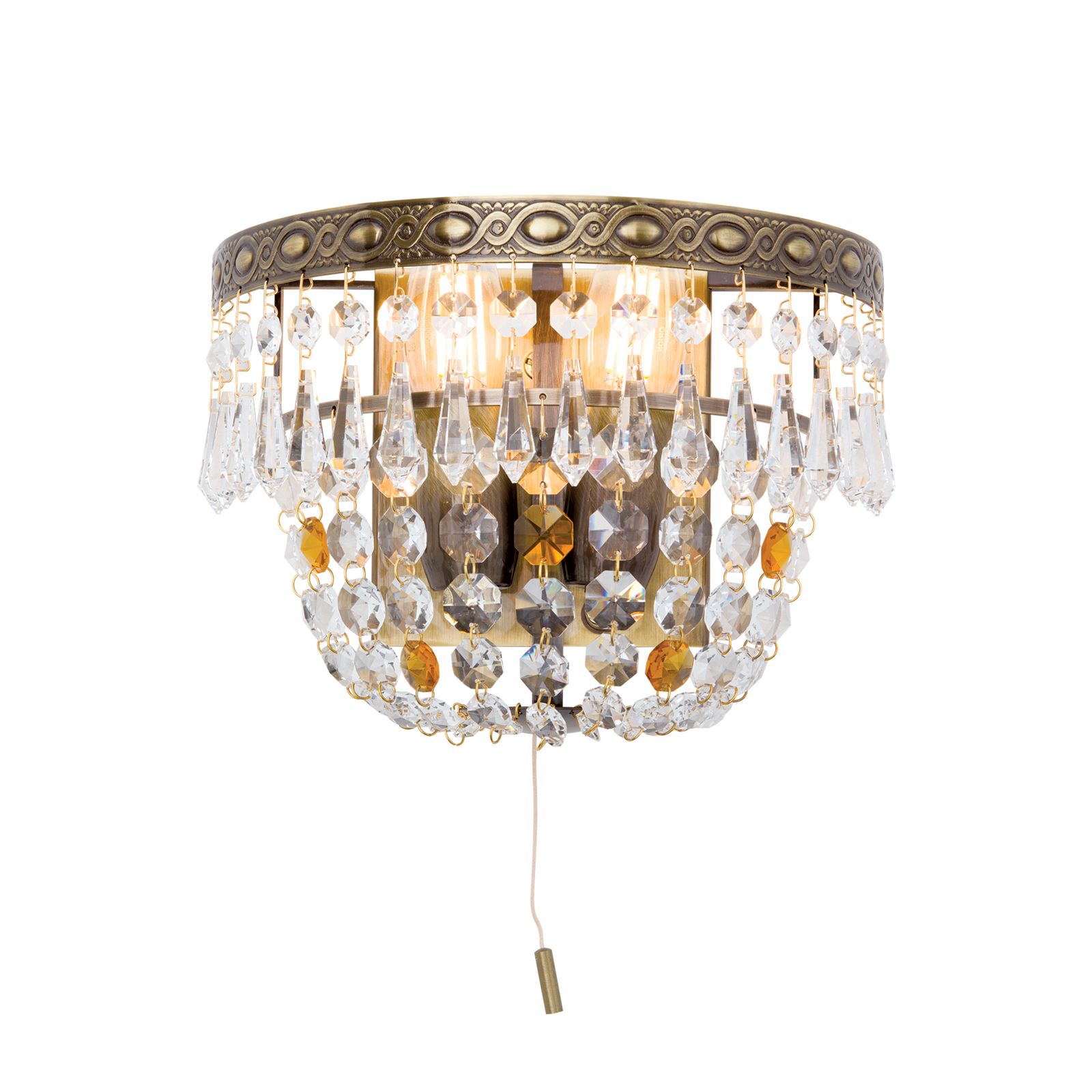 Das Gestell aus Vollmessing in Patina-Optik und besteht aus einem kunstvoll verzierten Ring sowie einem weiteren, der sich hinter den Kristallen versteckt und Kristallketten trägt, die zur Wandhalterung mittig zulaufen. Der präsente Zierring trägt eine Mischung aus Koppen und tropfenförmigen Kristallen, die für zusätzliches Glitzern und Funkeln verantwortlich sind. Ausgestattet mit 2 E14-Fassungen kann die Leuchte mit maximal 40 Watt je Fassung betrieben werden. Für unkompliziertes und einfaches Ein- und Ausschalten sorgt ein Zugschalter, der die Leuchte für den Einsatz als Wandlampe über einem Nachttisch prädestiniert.