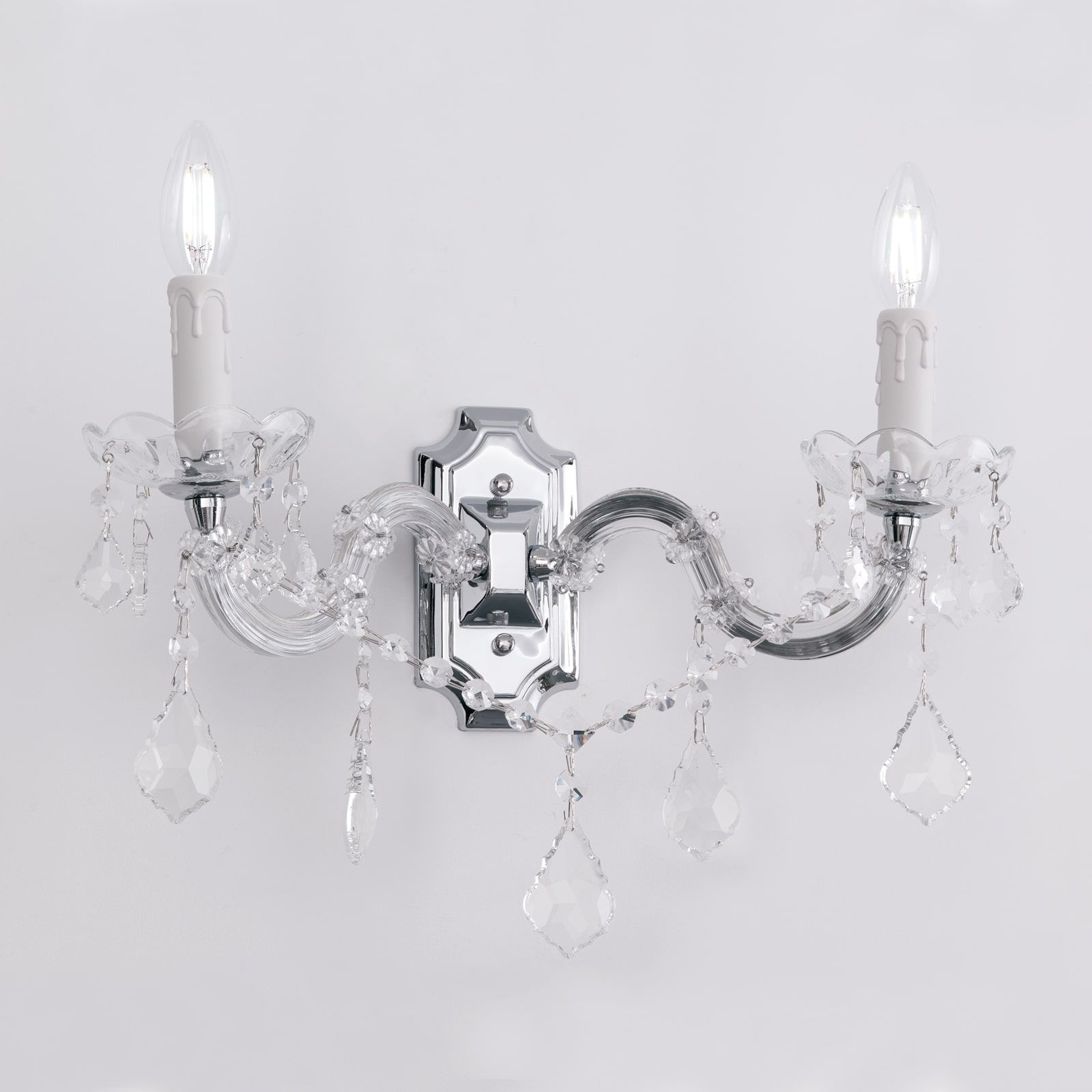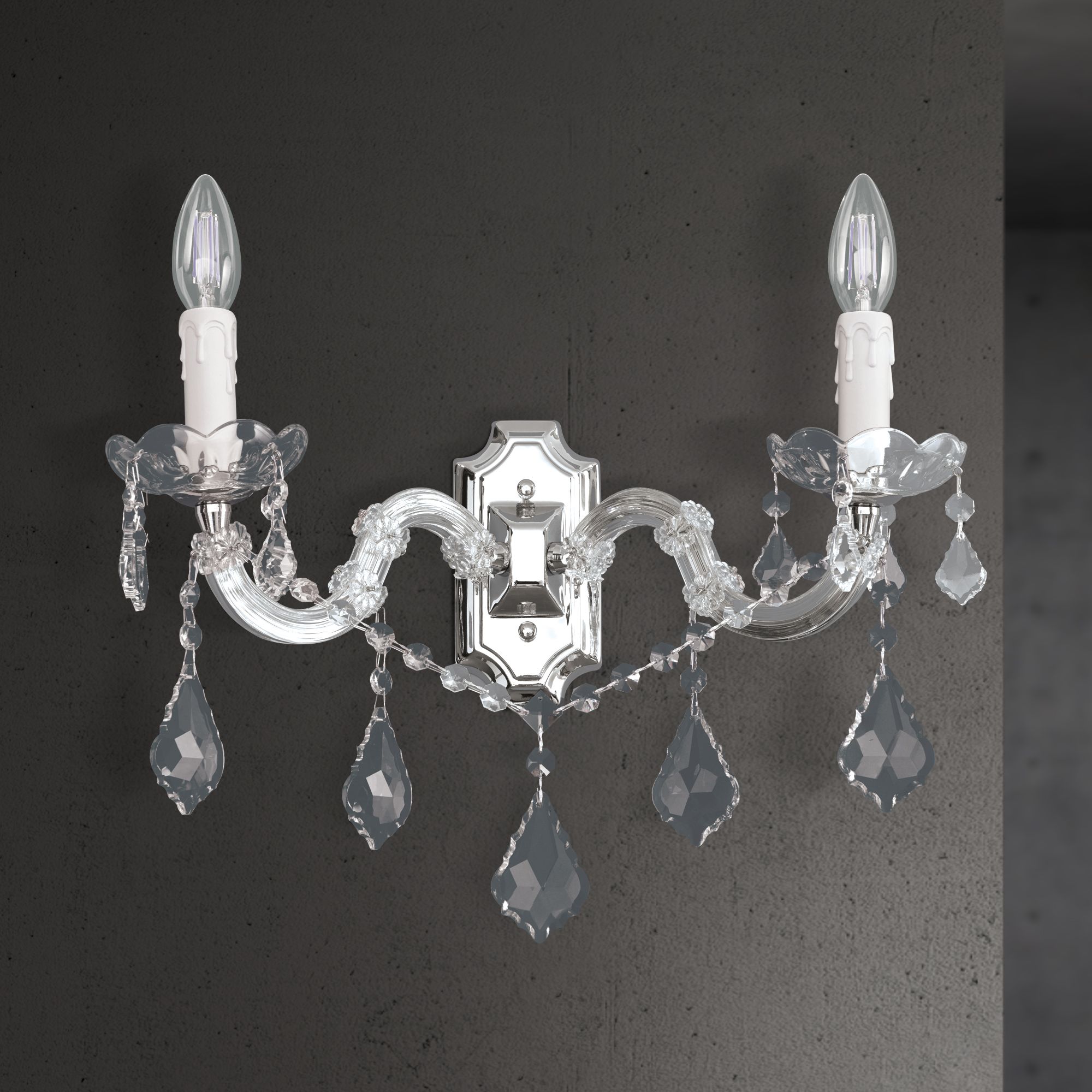 Die 2-flammige Leuchte aus der Produktreihe THERESA verschreibt sich dem Stil der weltberühmten böhmischen Glaskunst. So stand die böhmische gläserne Krone etwa den Murano-Lustern Pate. Nicht fehlen dürfen natürlich Kristallbehang in Pendelform, Perlenketten und gläserne Wachstropfenschalen von denen die beiden S-bogenförmigen Arme an der Wand zusammenlaufen. Brokattapeten, dunkle gedämpfte Farben, Stoffe und dunkles nach Harz duftende Möbel werden das edle Bild abrunden. Die Leuchte verfügt über zwei E14-Fassungen zu je bis zu 40 Watt - zum Beispiel mit stilgerechten flackernden Kerzenleuchten.
