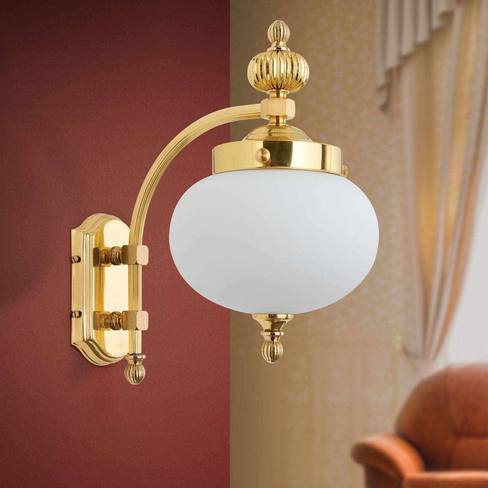 Wandleuchte WIENER NOSTALGIE, 1-flammig, Messing-glänzend, mit opal mattem Glas, abwärts